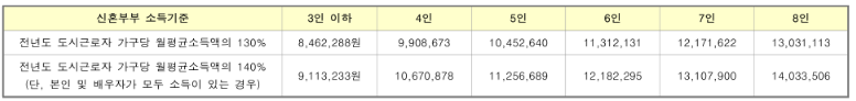 위 표는 신혼부부의 소득기준 표이지만, 예비신혼부부, 한부모가족의 소득 기준표와 동일합니다.