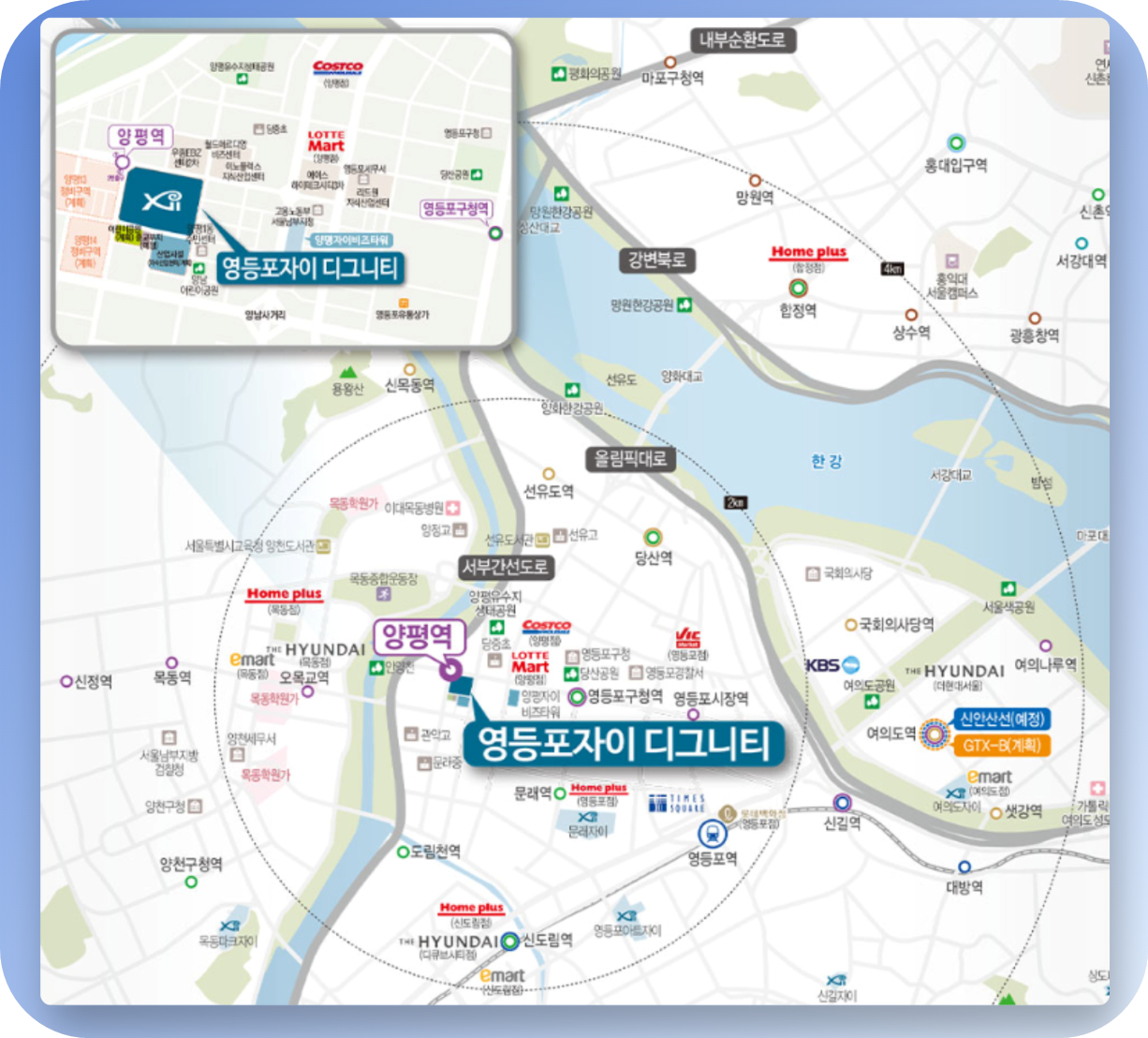 주변 환경으로는 가까운 5호선 양평역과 함께 2호선 영등포 구청역도 800m 거리에 위치해 있습니다. 초등학교가 350m 정도 떨어져 있으며, 양평 유수지 생태공원도 도보 10분 거리에 위치해 있습니다. 또한 가까운 거리에 코스트코, 롯데마트도 있어 입지 환경을 최상급이 아닐까 예상이 됩니다.