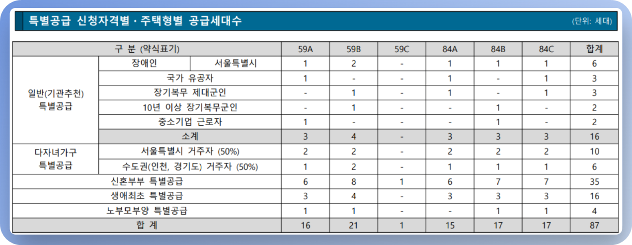- 특별공급: 총 87세대