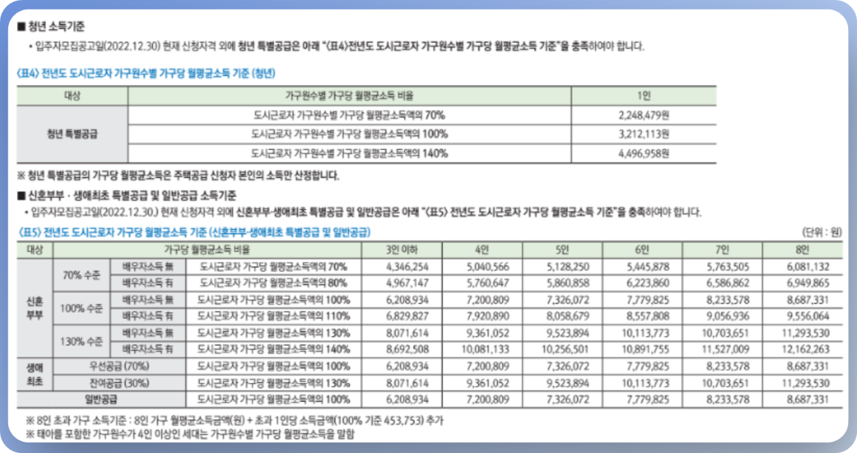 도시근로자 가구당 월평균 소득을 기준으로 비율이 나워진 이유는 각 비율을 기준으로 하기 때문입니다. 가점제의 경우는 득점하는 점수가 달라지고, 일부 유형에서는 1순위와 2순위를 나누는 기준이 되기도 합니다.