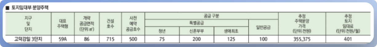 고덕강일 3단지에 관심이 있으시다면 입주자 모집 공고문을 통해 해당하는 유형의 구체적인 조건들을 추가로 확인하시기 바랍니다.
