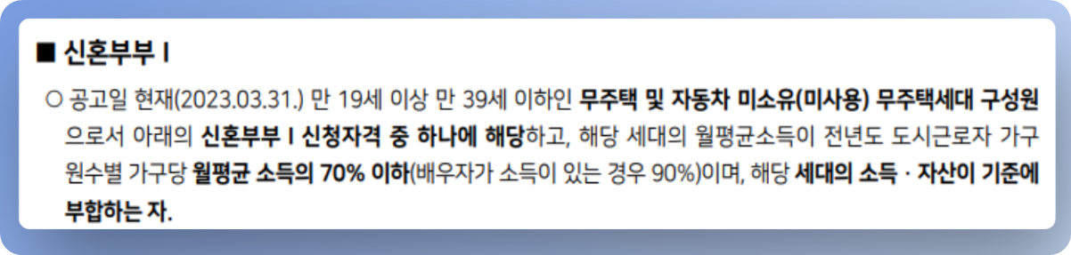 그렇다면 위의 3가지 조건 중 2번째 내용인 신혼부부 Ⅰ의 신청자격도 확인해 보죠.