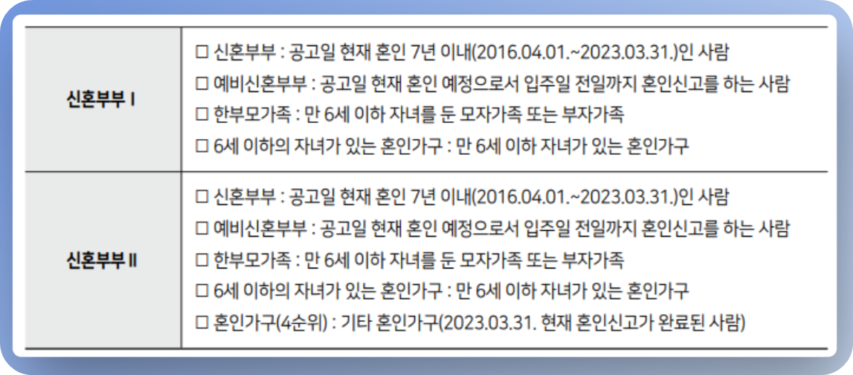 -  공고일 현재 혼인 7년 이내(2016. 04.01. ~ 2023. 03. 31.)인 사람
